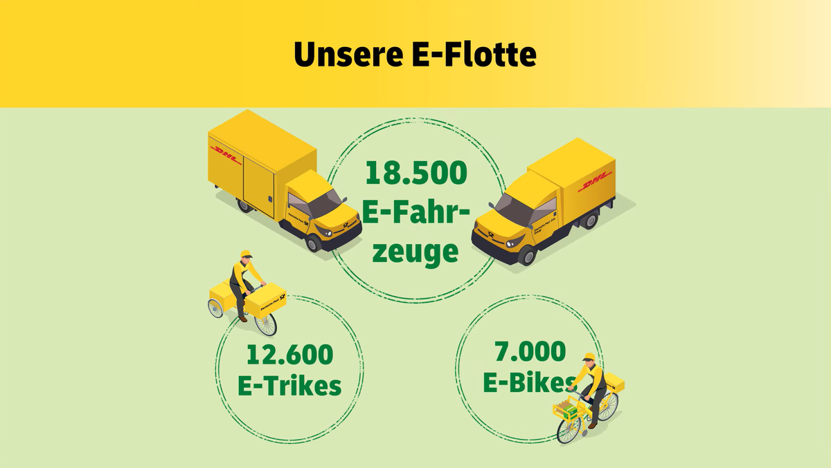 Kein anderer Logistikdienstleister investiert so viel in Elektromobilität, klimaneutrale Zustellung und innovative Lösungen wie wir. Derzeit haben wir in Deutschland bereits 20.000 Elektrotransporter und 12.400 E-Trikes im Einsatz. Bis 2025 wird die E-Flotte auf 38.000 E-Nutzfahrzeuge anwachsen. Bis 2030 sollen weltweit 60 Prozent der Flotte elektrifiziert werden.